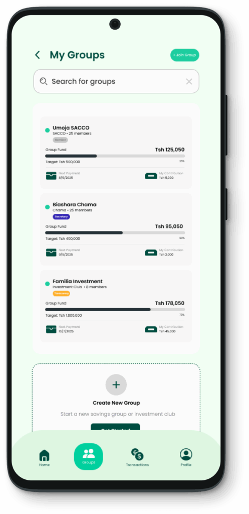 Easily create or join a Mchezo group, invite members, and set contribution amounts and cycles.